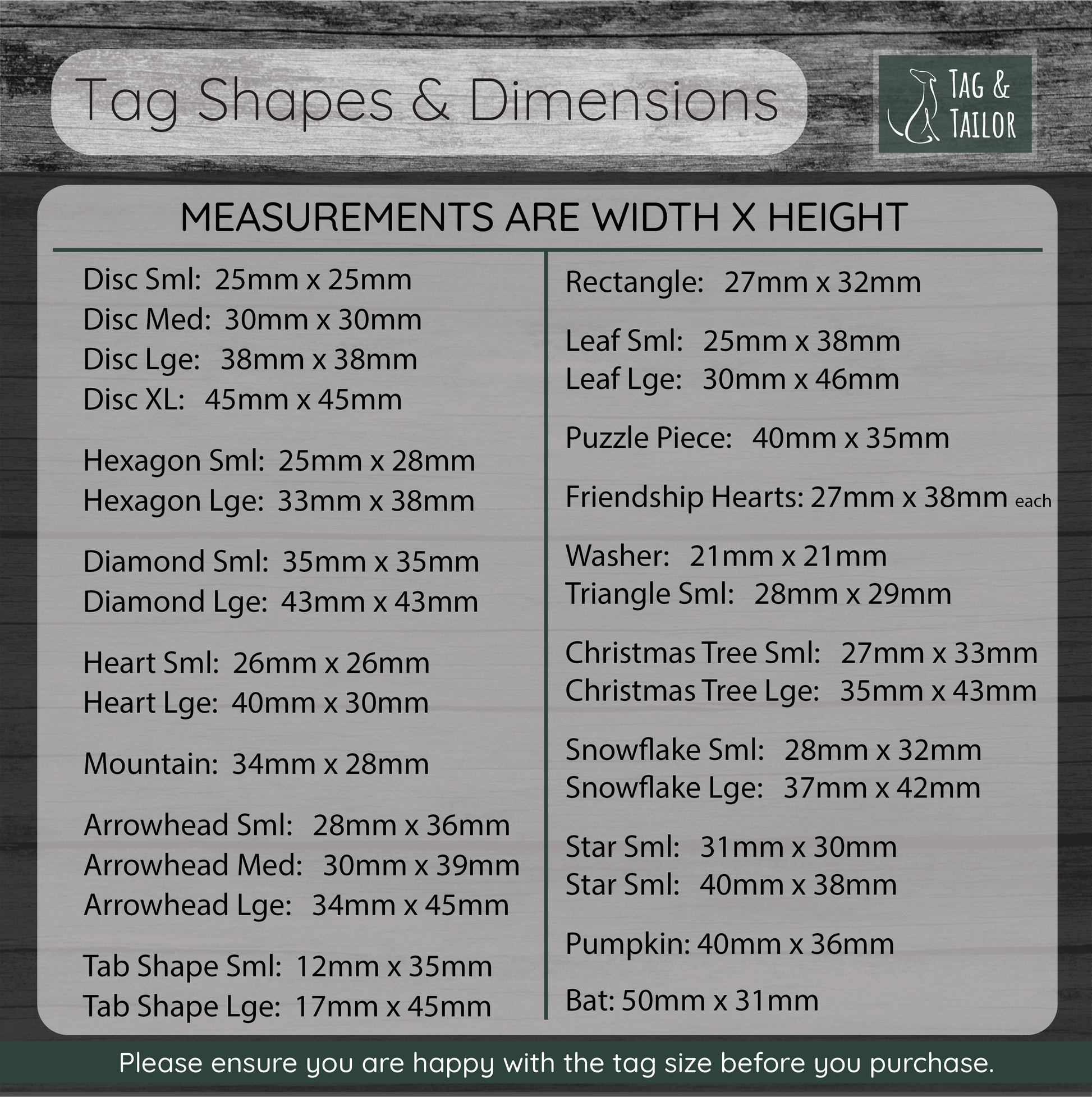 Please note that designs and text positioning may vary depending on which shape and size tag you choose.