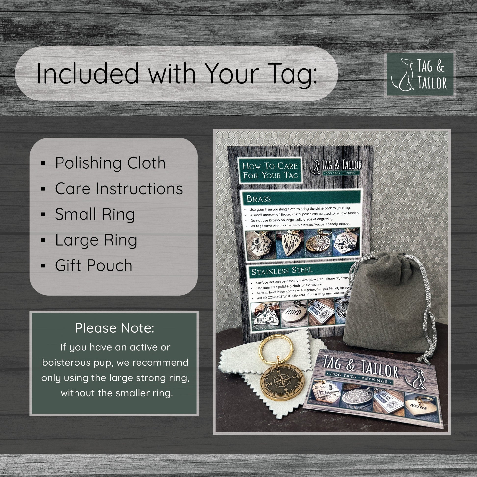 Tag and Tailor pet tags are designed and made in the UK using high quality, 2mm thick, solid brass and stainless steel. They are engraved using a fiber laser, then sanded and finished by hand.