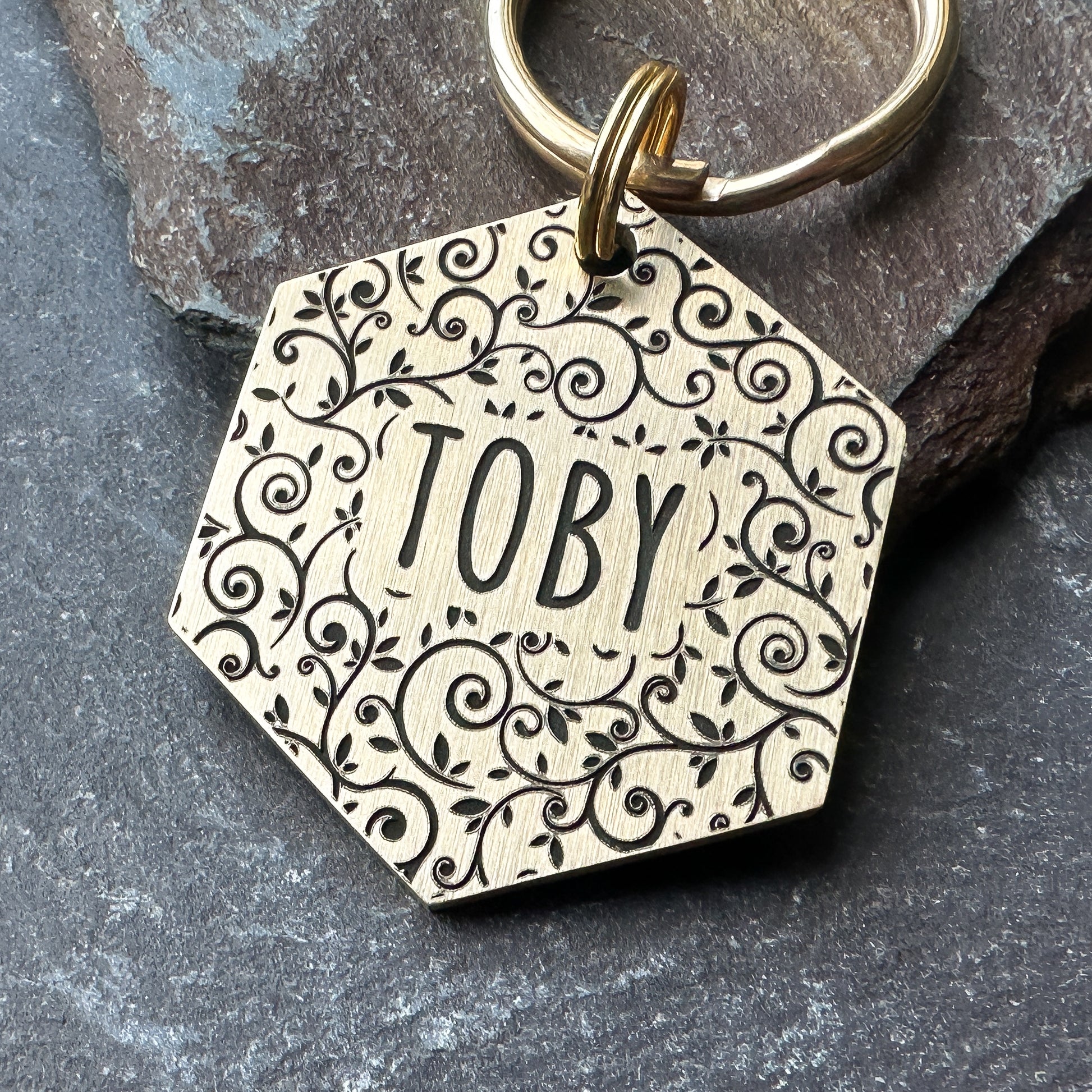 Tag and Tailor pet tags are designed and made in the UK using high quality, 2mm thick, solid brass and stainless steel. They are engraved using a fiber laser, then sanded and finished by hand.
