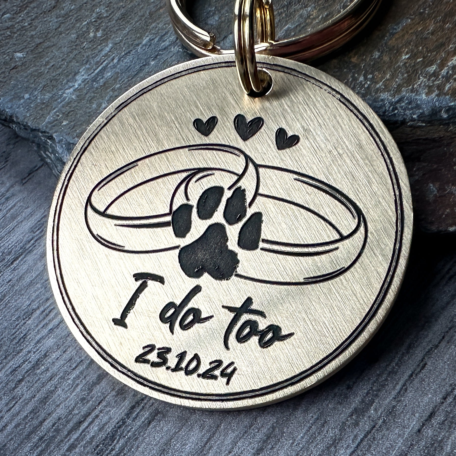 Tag and Tailor pet tags are designed and made in the UK using high quality, 2mm thick, solid brass and stainless steel. They are engraved using a fiber laser, then sanded and finished by hand.